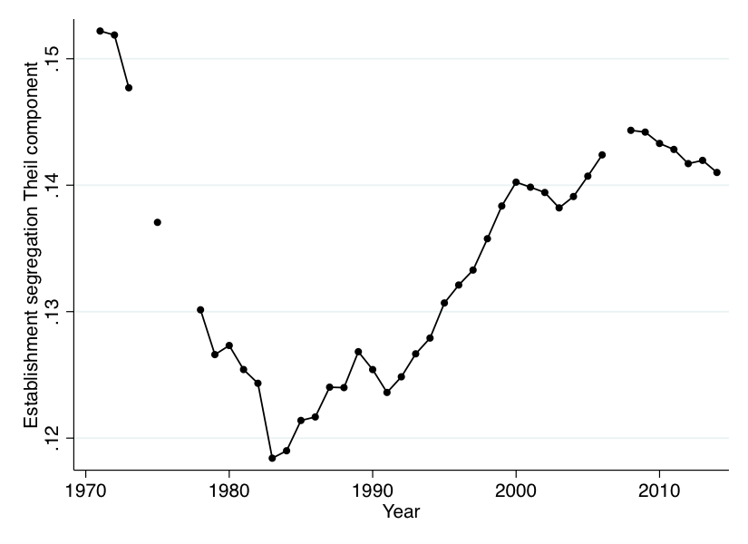 Same Planet, Different Worlds? Shifting Firm Boundaries and Racial Employment Segregation. This presents a theory I've been working on for a while: that the rise of external contracting, combined with the correlation of race and occupation in the United States, has let between-firm segregation rise even as measured within-firm occupational segregation has fallen and the typical workplace has come to seem more diverse. The meat is an adaptation of segregation metrics I've used elsewhere to add a spatial component and to show how the spatially-weighted metrics diverge from the aspatial ones in ways consistent with the theory.